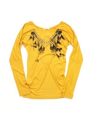 Elastyczna bluzka z super długimi rękawami. Z przodu czarna aplikacja zdobiona cyrkoniami.