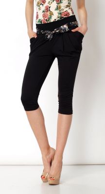 Bardzo wygodne dresowe bermudy. Czarne rybaczki z modnym drapowaniem z przodu. Po bokach kieszenie. W pasie szlufki oraz atłasowa kwiecista tasiemka, którą zawiązać można w efektowna kokardę. Materiał przyjemny w dotyku, z przewagą bawełny w składzie. Spodenki ładnie wysmuklają nogi....