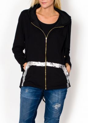 Narzutka z kapturem, wykonana z mięciutkiej w dotyku dresowej dzianiny, która ładnie układa się na sylwetce. Zapinana na złoty zamek. Długie rękawy. Z przodu duże wsuwane kieszenie z błyszczącym printem. Dół inspirowany kultową parką, z rozcięciem oraz sznurkiem do...