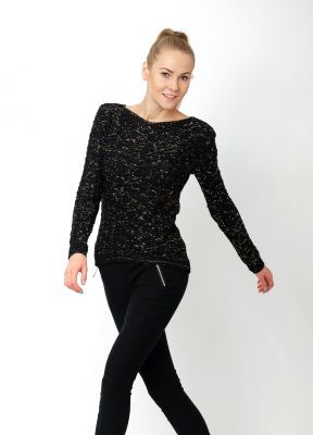 Sweter, dekolt łódka, z tyłu łezka, w splocie złota, lśniąca nitka.