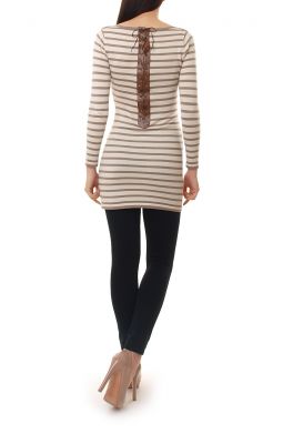 Długi, modny sweter w paski. Tunika z długim rękawem. Z tyłu, na plecach bardzo ciekawa imitacja wiązania a`la gorset. Dekolt w kształcie łódki. Dół i rękawy zakończone delikatnym ściągaczem. Idealna zarówno do legginsów, jak i spodni. Ciepły i wygodny kardigan.