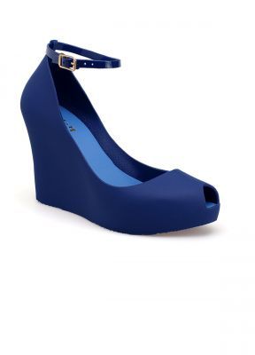 Gumowe buty na koturnie o matowym princie, odkryte noski, przy kostce zapięcie na cienkim pasku.