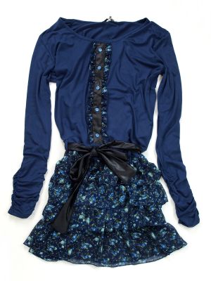 Kobieca sukieneczka ze zwiewnymi falbankami, w pasie wiązana tasiemką. Długie marszczone rękawy. Skład: 95% wiskoza, 5% elastan.
