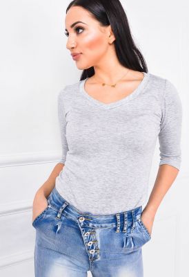 Bluzka o lekko melanżowej strukturze, z rękawem 3/4. Dekolt a'la serek. Klasyczny fason, dopasowana. Miękki i przyjemny materiał. Bez nadruków i dodatków - bazowy element stylizacji. Modne i uniwersalne kolory do wyboru. Produkt polski.