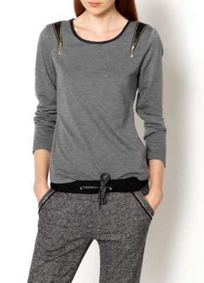 Bluzka, na ramionach z rozpinanym zamkiem i ekoskórą, miękki materiał, dekolt okrągły z lamówką