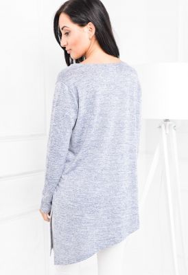 Miękka melanżowa bluzka tunika z ciekawym dołem. Luźny krój oversize. Okrągły dekolt, długie rękawy. Dół asymetryczny, ze ścieciem po skosie - jedna strona dłuższa, z rozcięciem. Lekka i przyjemna w dotyku dzianina. Modne kolory do wyboru. Produkt polski.