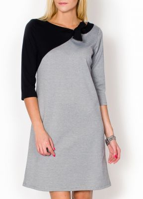 Trapezowa sukienka, ocieplana, dwukolorowa. Wykonana z grubszego materiału dobrego gatunkowo. Zapinana na plecach na kryty suwak. Dekolt okrągły z wiązaniem, z którego wyczarujesz ładną kokardę, która z powodzeniem zastąpi biżuterię. Kontrastowy rękaw 3/4.