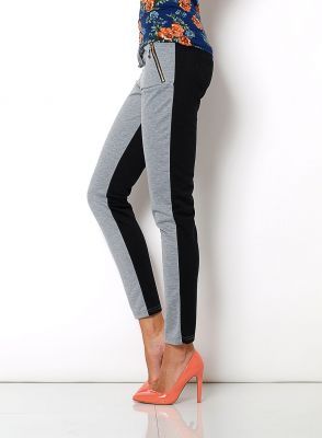 Dwukolorowe spodnie dresowe, rurki, w pasie posiadają gumkę i sznurek do regulacji, z przodu kieszenie na złoty zamek, z tyłu kieszenie bez zdobień.