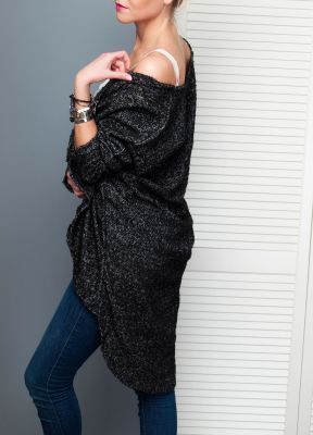 Modny kardigan z materiału typu boucle o oversizowym fasonie. Ciepły materiał typu boucle (tkanina pętelkowa). Lekko asymetryczny - tył dłuższy od przodu. Długie rękawy. Pod pachami luźniejszy.