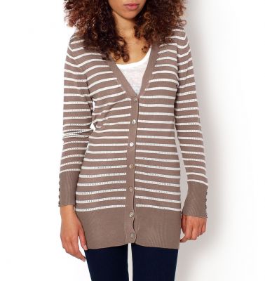 Kardigan/sweter w paski, zapinany na guziki, dłuższy fason, dekolt w serek, rękawy i dół zakończone ściągaczem, przy zakończeniu rękawów rząd kilku ozdobnych guzików.