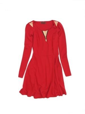 Kloszowana sukienka ze wstawkami z materiału imitującego zamsz. Na dekolcie zdobiona zapinanym miedzianym zamkiem. Super kobieca dzianinowa sukienka. Długość mini /midi.