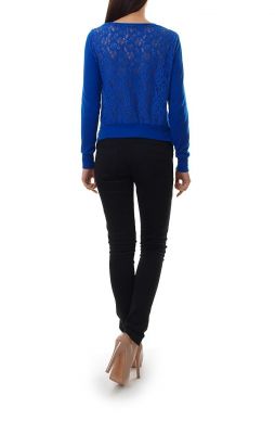 Piękny, elegancki sweterek. Kardigan z delikatną koronką na plecach i ramionach. Rękawy oraz przód gładkie. Przód sweterka dłuższy. Po bokach, przy ściągaczu, delikatne drapowania. Pięknie prezentuje się na sylwetce. Idealny jako narzutka.