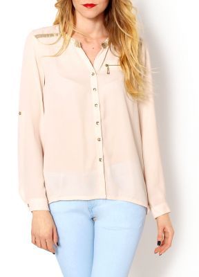 Koszula szyfonowa, zapinana na guziki, półprzezroczysta, okrągły dekolt, dekolt i ramione ze złota lamówką, na piersi zamek z imitacją kieszeni, długi rękaw z możliwością podpięcia, rękaw z mankietem, tył lekko dłuższy.