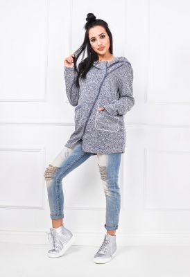 Ciepły sweter kardigan z długim rękawem. Z tyłu kaptur. Zapinany na skośny, długi zamek z przodu. Dwie kieszenie przy biodrach. Miękki środek. Ciepły i przyjemny materiał o lekko melanżowej strukturze. Dostępny w klasycznych kolorach. Produkt polski.