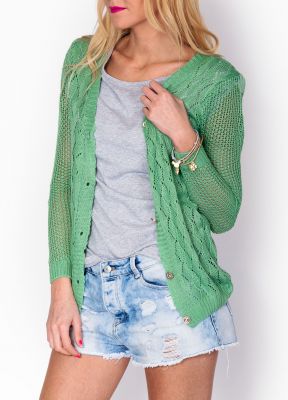 Śliczny rozpinany kardigan z długim rękawem. Idealna propozycja na chłodniejsze letnie wieczory oraz nadchodzące jesienne dni. Modny sweter z dzianiny o ozdobnym, ażurowym splocie. Dół oraz rękawki zakończone ściągaczami. Dekolt w serek. Sweterek zapinany jest na ozdobne, połyskujące...