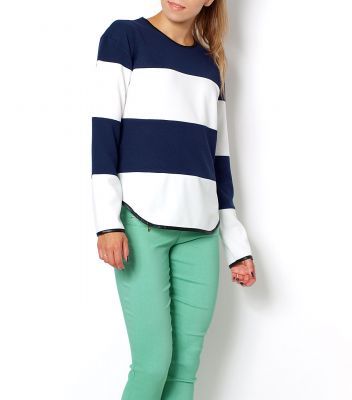 Modna bluzka w szerokie pasy, z długim rękawem. Wykonana z dobrego gatunkwo, pikowanego materiału. Bluzka posiada wykończenia z czarnej lamówki a`la skóra. Asymetryczna - tył delikatnie dłuższy, dzięki czemu świetnie komponuje się w zestawieniu np. z legginsami, czy klasycznymi...