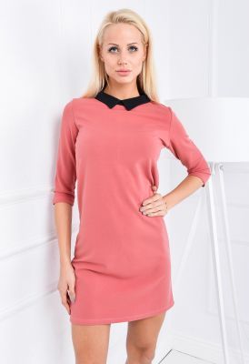 Sukienka tuba o gładkiej strukturze z kołnierzykiem. Okrągły dekolt z kontrastowym, trójkątnym kołnierzykiem. Rękaw 3/4. Prosty luźny krój tuby. Zapinana na kryty zamek. Materiał nieprześwitujący. Klasyczne i modne kolory do wyboru.