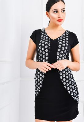 Dopasowana sukienka mini, bardzo kobiecy fason. Sukienka z wygodnego, rozciągliwego materiału. Krótki rękawek. Ozdobiona z przodu z cekinami. Dodatkowo modny dekolt w kształcie litery V. Z tyłu wycięcie w kształcie łezki.