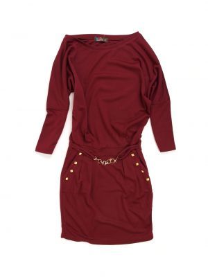 Klasyczna komfortowa sukienka, taliowana i zdobiona złotym paskiem. Z kieszeniami z dodatkiem ćwieków. Luźny krój kimona, u dołu w kształcie delikatnej, zwężanej bombki / tulipana. Produkt wykonany z dzianiny z przewagą bawełny. Długość mini / midi. Rękaw 3/4.
