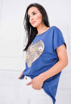 Bluzka / T-shirt ze złotym sercem. Okrągły dekolt, krótkie rękawki. Dopasowany krój, lekko nietoperzowy pod pachami. Dostępna w modnych kolorach. Produkt turecki dobrej jakości. Oryginalna, bardzo kobieca bluzka, praktyczna propozycja na każdą okazję ze złotym wzorem do ożywienia...