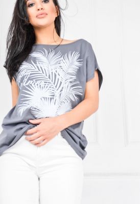 Koszulka / T-shirt z nadrukiem - liście palmowe. Okrągły dekolt, krótkie rękawki. Luźny krój, lekko nietoperzowy pod pachami. Dostępna w modnych kolorach do wyboru. Produkt turecki dobrej jakości.